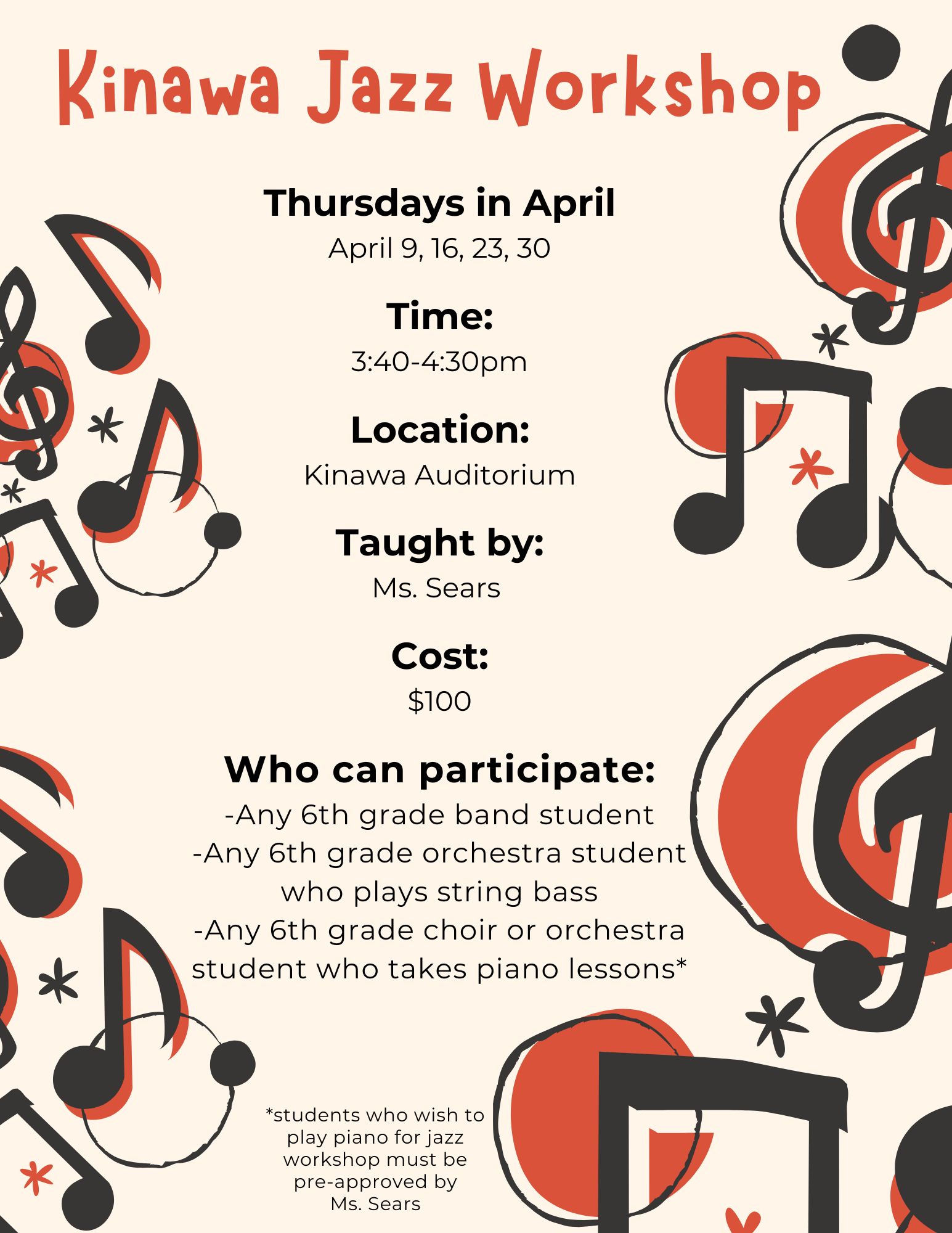 Ms. Sears is excited to offer a Jazz Workshop at Kinawa this spring! This jazz workshop will be for students currently enrolled in a 6th grade music class who want to explore and learn about the music style of jazz. Throughout the workshop, we will focus on the fundamentals of jazz music, including learning how to improvise and how to play swing music individually and as a group. This workshop meets for 4 weeks in April. The goal of this workshop is to give students an introduction to the world of jazz music, which is unlike anything they have experienced so far in school music classes. This workshop is designed for: any 6th grade band students, any 6th grade orchestra students who play string bass, and any 6th grade choir and orchestra students who take piano lessons.